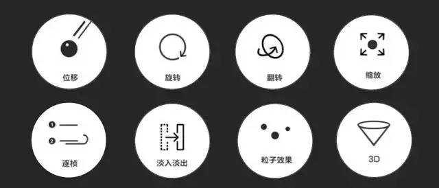 在H5内容展示中常见的动效有:移位、旋转、翻转、缩放、逐桢、淡入淡出、粒子效果、3D等,而我们能大致地将这些动效分为基础特效、招牌特效以及高难度特效三种类别。
