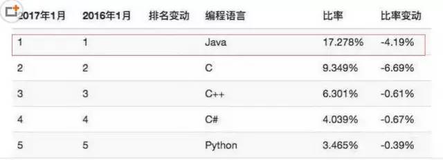 TIOBE 公布了2017年1月编程语言指数排行榜,排名前三的还是 Java、C、C++。2017年,Java编程语言第一的地位仍然无法撼动!