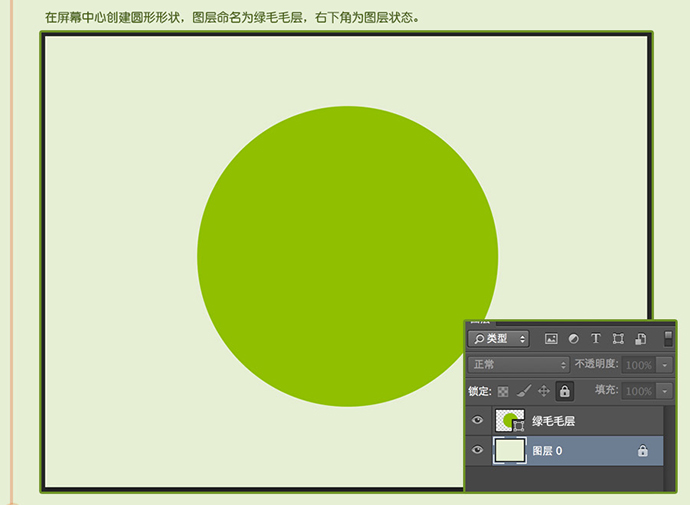 在屏幕中心创建圆形形状,图层命名为绿毛毛层,右下角为图层状态。