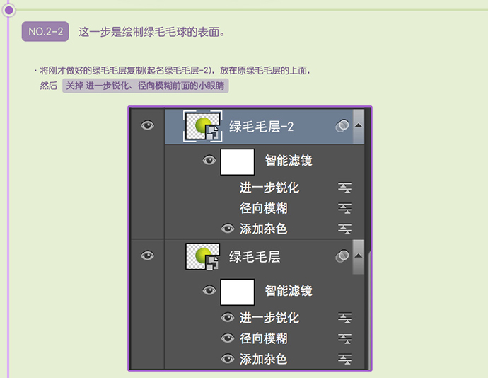 将刚才做好的绿毛毛层复制(起名绿毛毛层-2),放在原绿毛毛层的上面,然后关掉 进一步锐化、径向模糊前面的小眼睛。