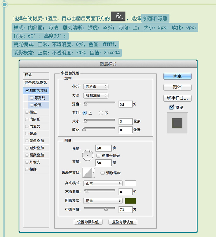 样式:内斜面; 方法:雕刻清晰; 深度:53%; 方向:上; 大小:5px; 软化:0px;