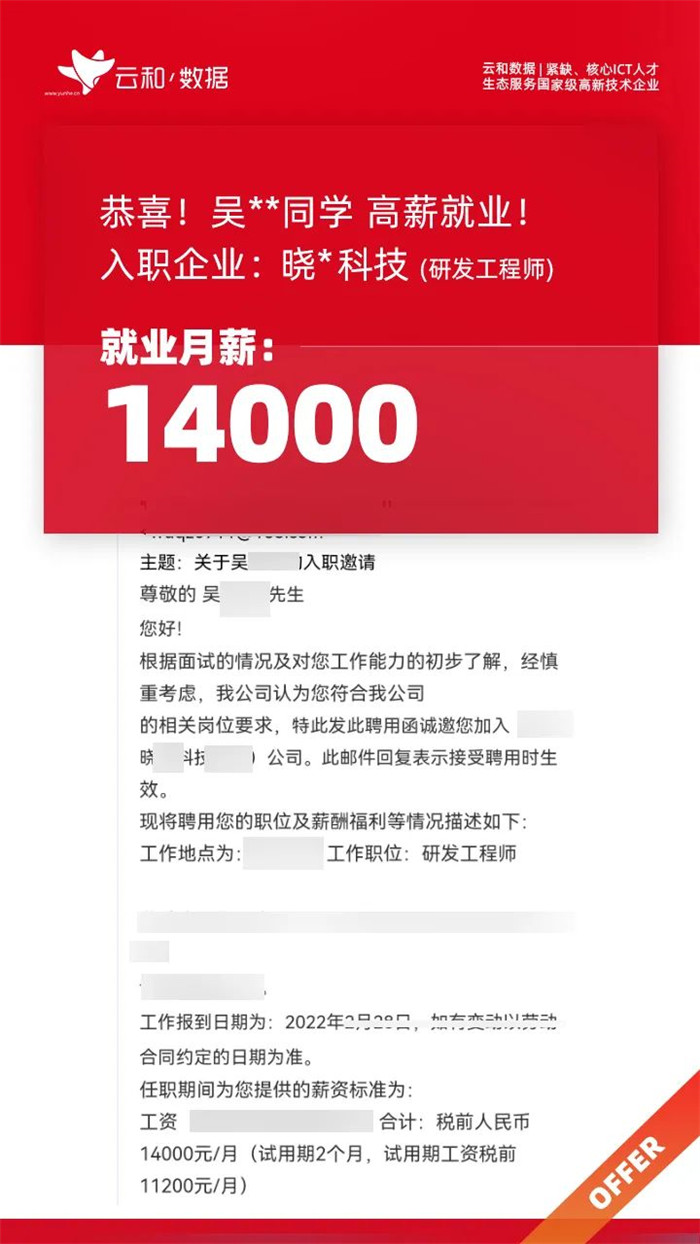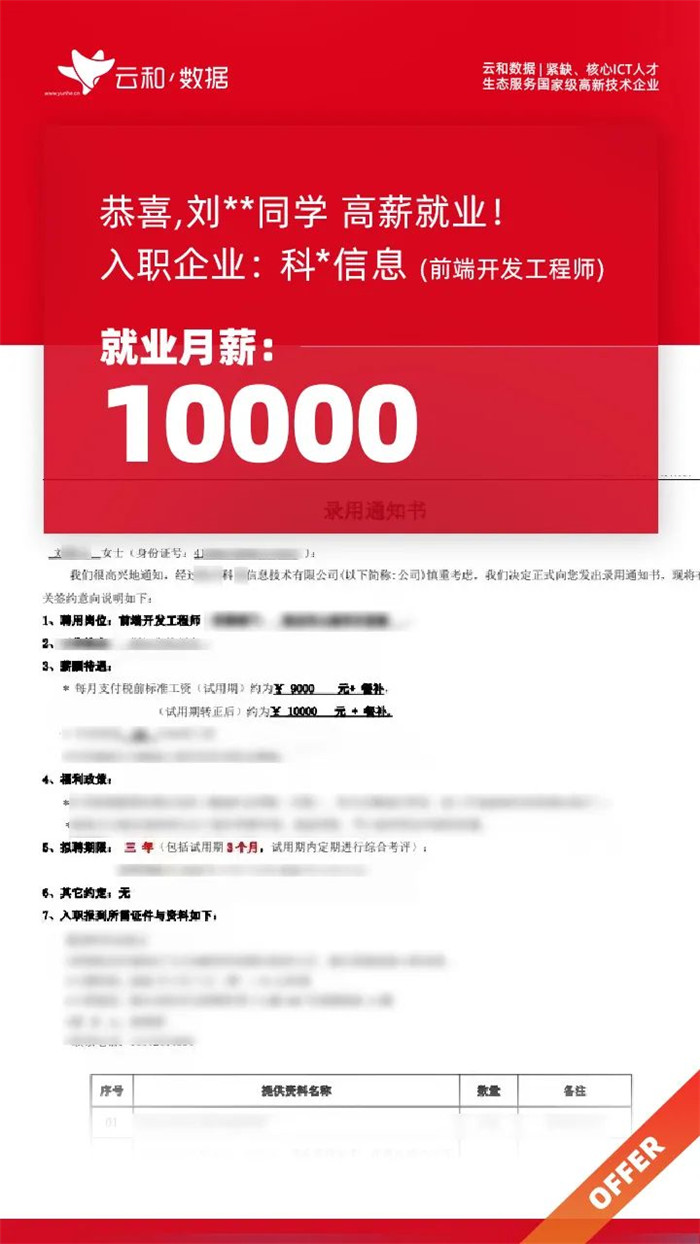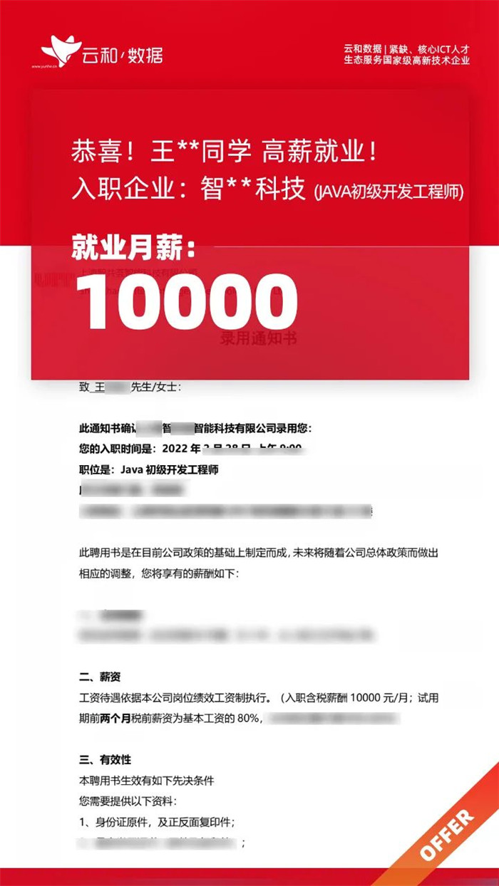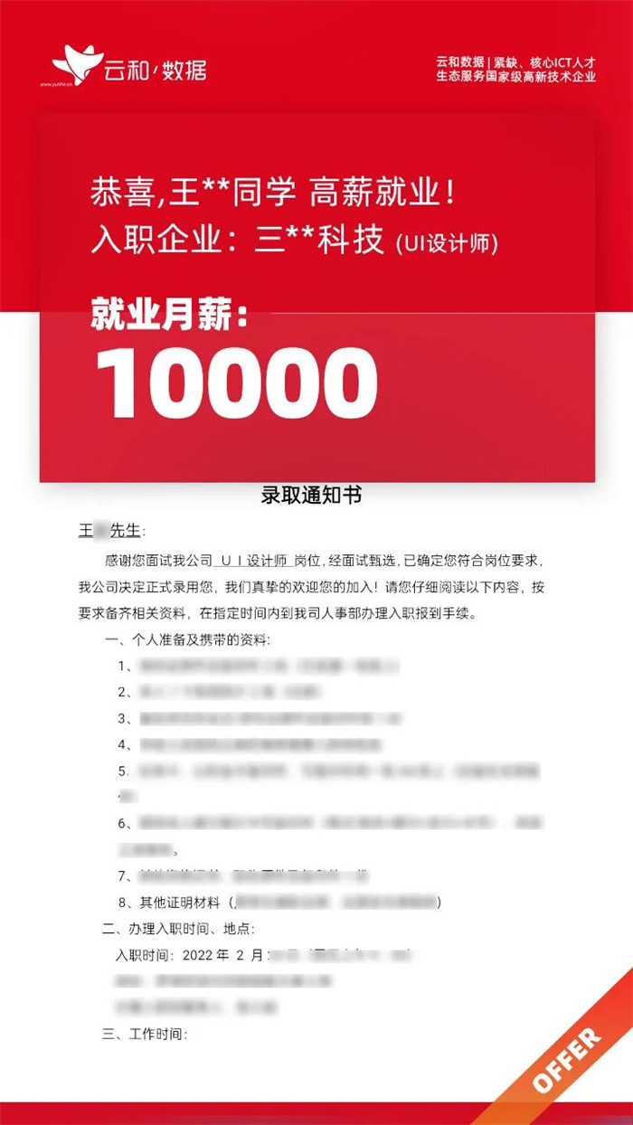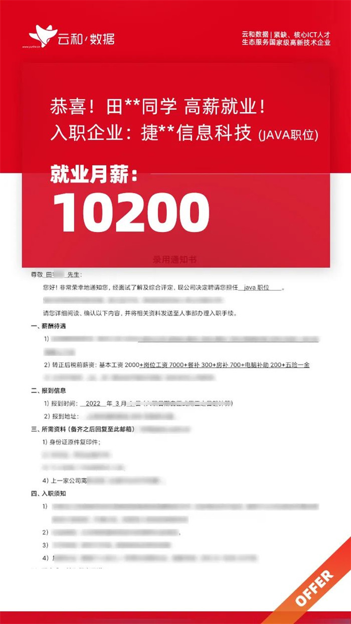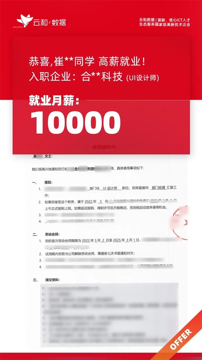 云和数据ICT职业教育发挥公司产业化优势与技术积淀,整合国内外优秀师资,累计自主研发140余项教辅、教材,115项实践教学实训平台,采用六位一体项目制教学模式,年培养高端ICT技术人才超10000人,其中线下ICT职业教育5500余人,累计为企业输送高端泛ICT技术人才超8万人,60%来自于口碑推荐。更大规模、更多人选择;更好的ICT学习、更好的就业。云和数据人才培养技术方向涵盖大数据、云计算、人工智能虚拟现实JAVA软件工程UI用户体验设计Web前端开发网络安全八大方向,云和数据以八大精品课程为基础,八大就业基地为依托,一次就业率99.02%,61.9%就业薪资超1W,以大数据为首的精品专业平均薪资13.25K。