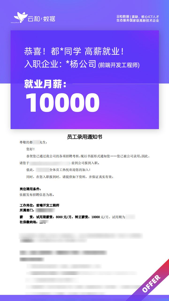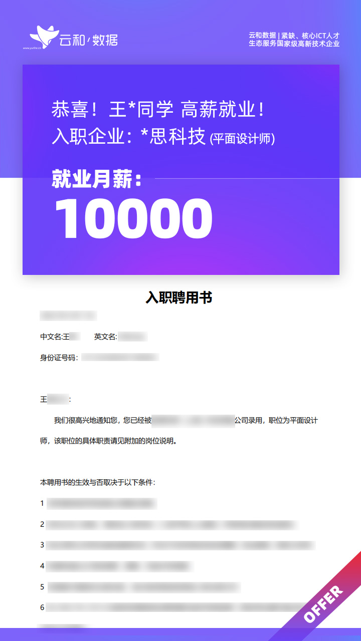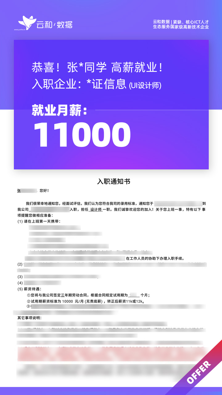 云和数据ICT职业教育发挥公司产业化优势与技术积淀,整合国内外优秀师资,累计自主研发140余项教辅、教材,115项实践教学实训平台,采用六位一体项目制教学模式,年培养高端ICT技术人才超10000人,其中线下ICT职业教育5500余人,累计为企业输送高端泛ICT技术人才超8万人,60%来自于口碑推荐。更大规模、更多人选择;更好的ICT学习、更好的就业。云和数据人才培养技术方向涵盖大数据、云计算、人工智能、虚拟现实、JAVA软件工程、UI用户体验设计、Web前端开发、网络安全八大方向,云和数据以八大精品课程为基础,八大就业基地为依托,一次就业率99.02%,61.9%就业薪资超1W,以大数据为首的精品专业平均薪资13.25K。
