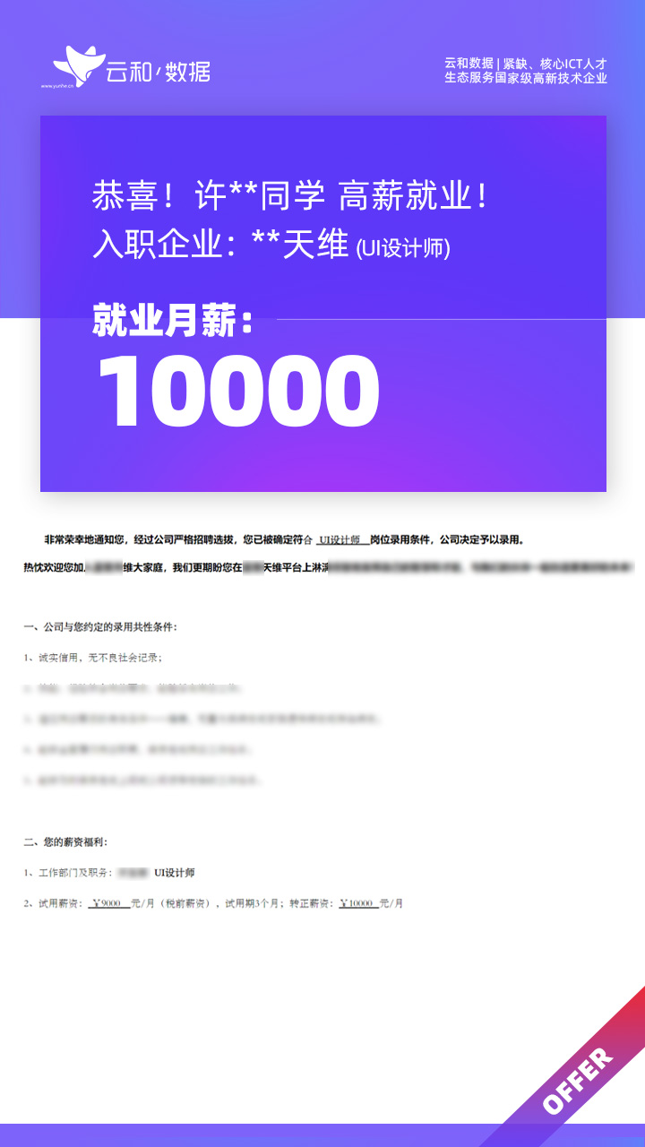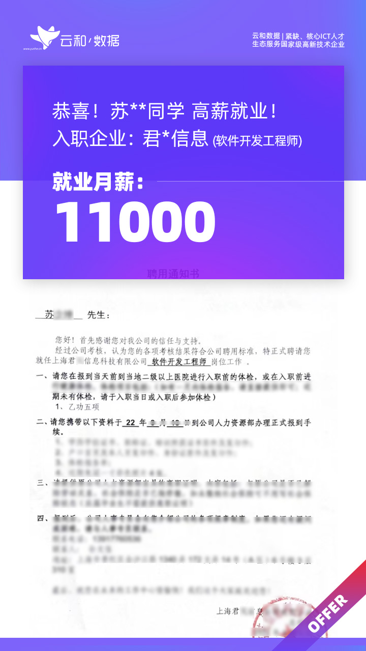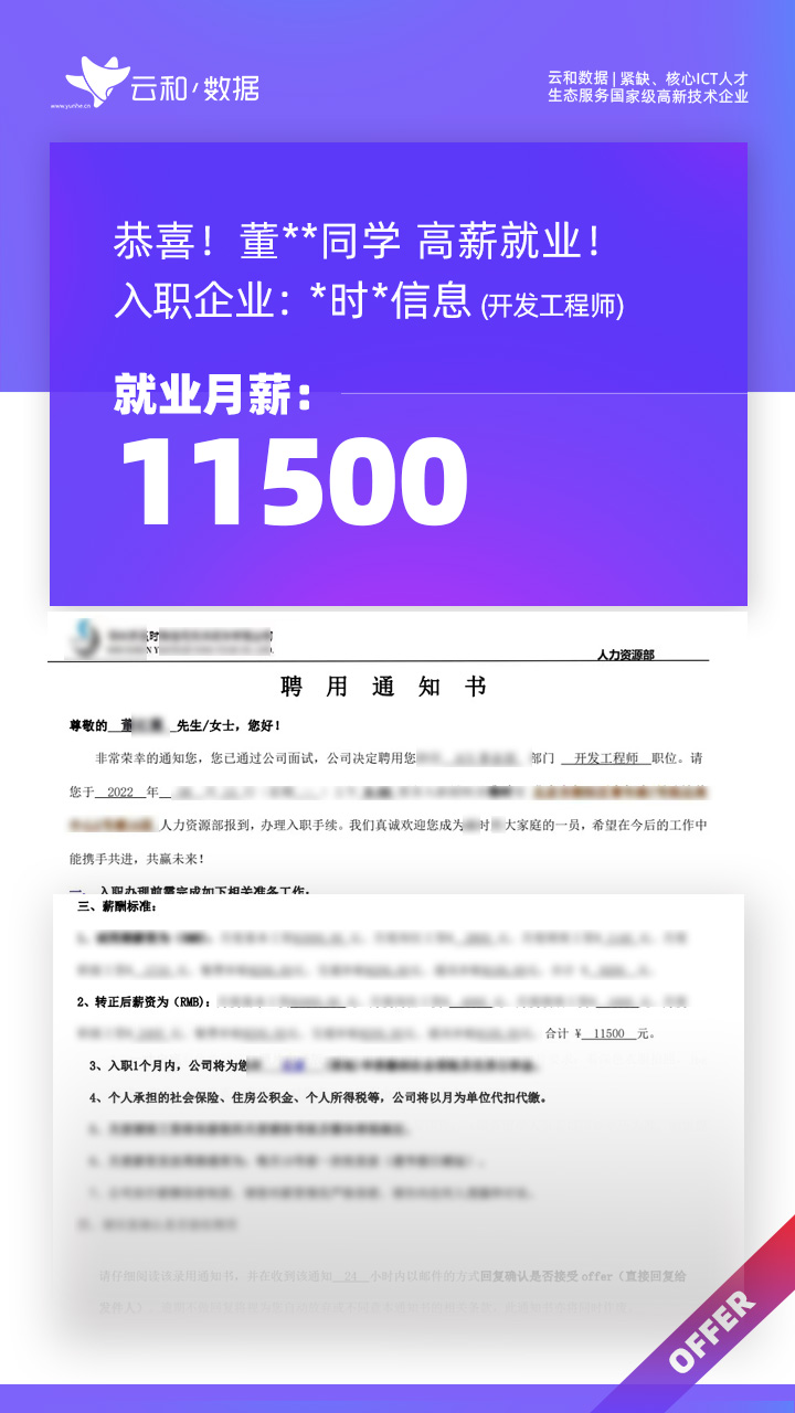 云和数据ICT职业教育发挥公司产业化优势与技术积淀,整合国内外优秀师资,累计自主研发140余项教辅、教材,115项实践教学实训平台,采用六位一体项目制教学模式,年培养高端ICT技术人才超10000人,其中线下ICT职业教育5500余人,累计为企业输送高端泛ICT技术人才超8万人,60%来自于口碑推荐。更大规模、更多人选择;更好的ICT学习、更好的就业。云和数据人才培养技术方向涵盖大数据、云计算、人工智能、虚拟现实、JAVA软件工程、UI用户体验设计、Web前端开发、网络安全八大方向,云和数据以八大精品课程为基础,八大就业基地为依托,一次就业率99.02%,61.9%就业薪资超1W,以大数据为首的精品专业平均薪资13.25K。