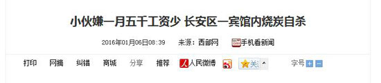 近期,一则题为《小伙嫌一月五千工资少长安区一宾馆内烧炭自杀》的新闻报道让小伙伴们都惊呆了。大概是这么个事儿:小伙子毕业两年,在深圳打工,月薪5000,嫌自己工资太少,再加上感情不顺,于是乎,烧炭自杀……