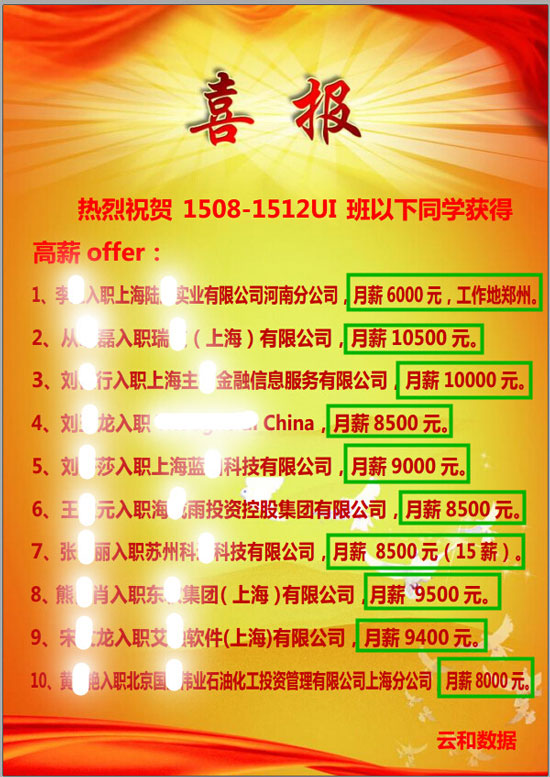 为提高竞争力,企业只能不惜重金聘请专业UI设计人才,就拿云和数据的学员来说,正常情况下,应届毕业生在上海从事UI设计相关工作,薪资大概在5000左右,普通培训机构出身的学员薪资大概在7000元左右,但是,云和数据在上海就业的UI学员平均薪资高达8000-8500元,新近一批就业offer显示,有学员最高薪资已经达到了10500元。