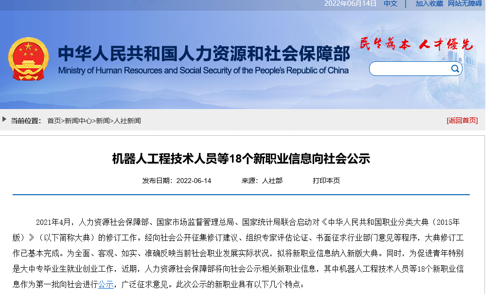 6月14日,人力资源和社会保障部向社会公示机器人工程技术人员、数据安全工程技术人员、碳汇计量评估师等18项新职业信息,涉及数字产业、绿色产业等多个新兴领域。