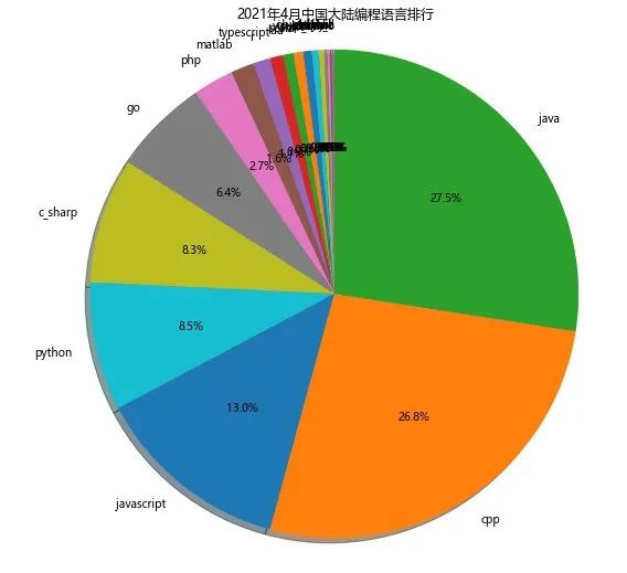 最新统计的国内4月编程语言排行榜中,JAVA以27.5%的优势排名第一,其次是C/C++ 26.8%,排名第三的是JavaScript 13%,第四才是Python 8.5%。