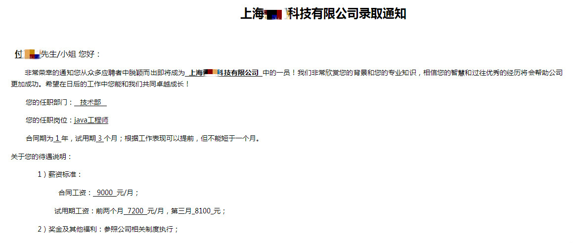 毕业前,我跟随就业老师来到上海面试了几家不错的企业,终于在临近毕业时,我收到了上海某科技有限公司的Java工程师入职offer,转正月薪9000元。我不仅成功的获得了一门技能,还获得了之前从不敢奢望的薪资。