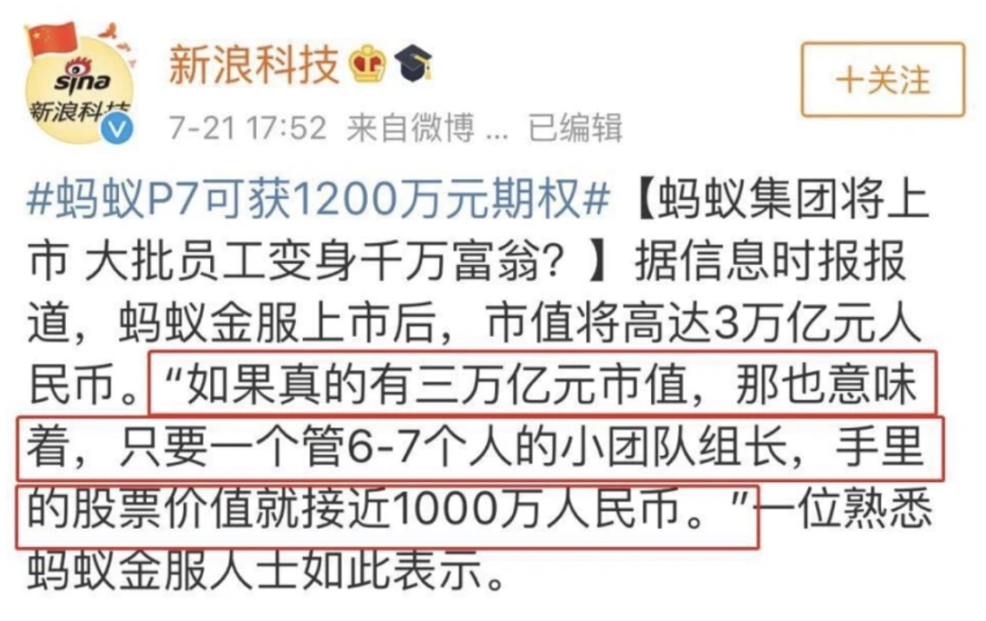 据网友爆料,2019年蚂蚁金服内部期权定价大约为每股400人民币。这就意味着如果一个P7员工,为蚂蚁金服服务四年,不算工资收入,仅仅计算期权收益在账面上就可以拿到1200万元。
