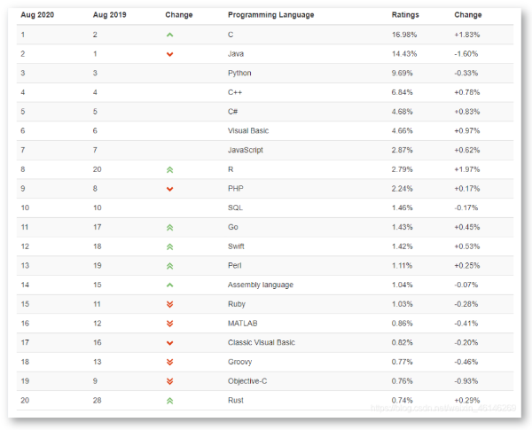 2020年8月TIOBE编程语言排行:C、JAVA、Python排名前三