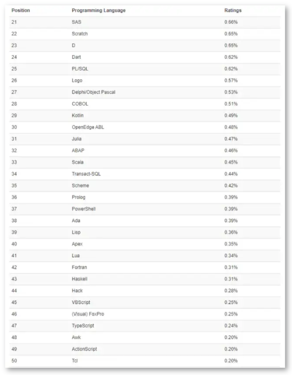 值得关注的是Go、Swift和SQL在排行榜第10名的竞争。Swift排名落后了2个名次(#10到#12),取而代之的是SQL重新的回到了第十位。同样值得注意的是Groovy以牺牲Scratch的代价重新进入TIOBE指数前20,Hack以44的位置进入前50。
