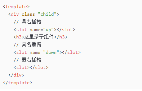 在这个例子里,因为父组件在<child></child>里面写了html模板,那么子组件的匿名插槽这块模板就是下面这样。也就是说,子组件的匿名插槽被使用了,是被下面这块模板使用了。