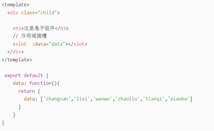最后,就是我们的作用域插槽。这个稍微难理解一点。官方叫它作用域插槽,实际上,对比前面两种插槽,我们可以叫它带数据的插槽。什么意思呢,就是前面两种,都是在组件的template里面写