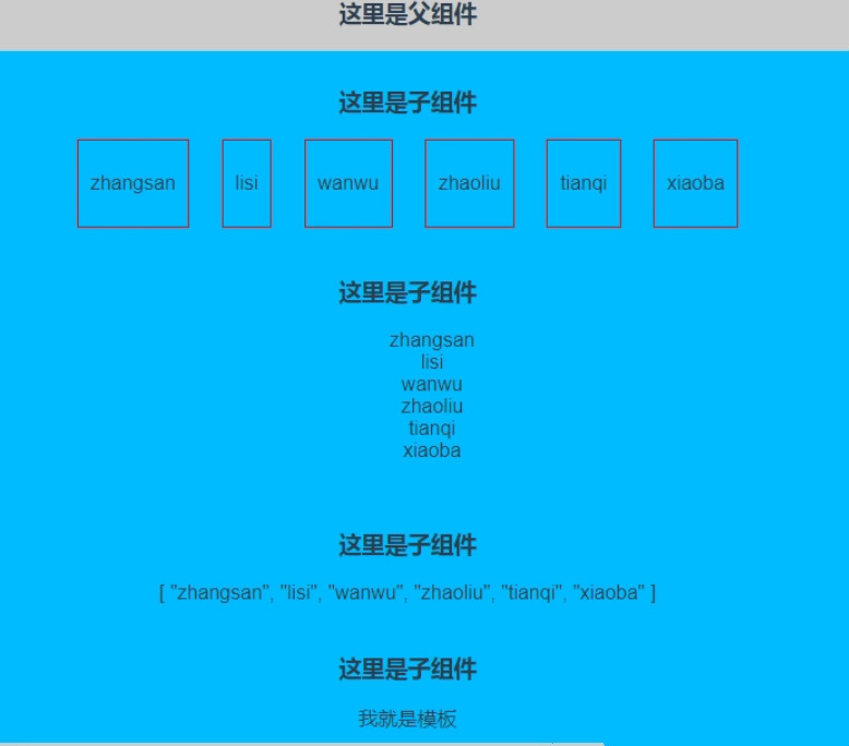 下面的例子,你就能看到,父组件提供了三种样式(分别是flex、ul、直接显示),都没有提供数据,数据使用的都是子组件插槽自己绑定的那个人名数组。