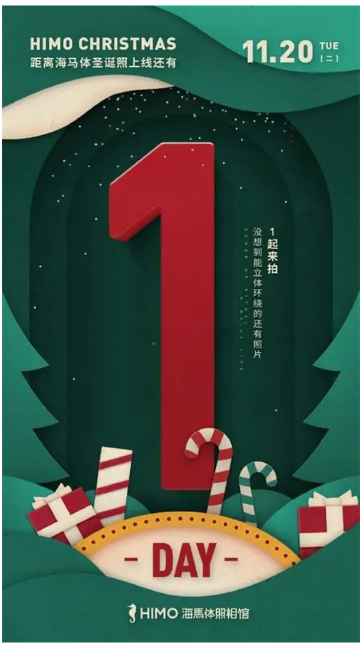 这是海马体圣诞活动倒计时海报,站在元素分类的角度分析:即便不看说明性文字,我们也能一眼就认出这是与圣诞节有关联的海报,那么是哪些视觉元素让你有这样的判断?