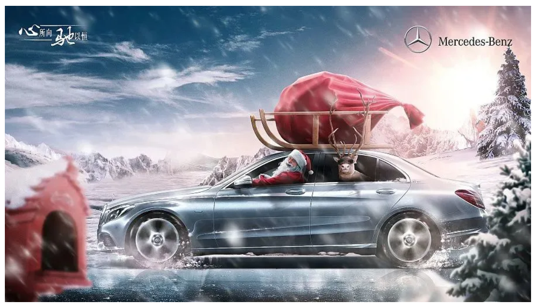 合成是设计师们常用的技法之一,圣诞节海报用合成也是最常见的方式,比如奔驰的这张海报,以圣诞老人送礼物为故事主题,既能体现出圣诞节的氛围,又给用户一种非常有趣的感受。