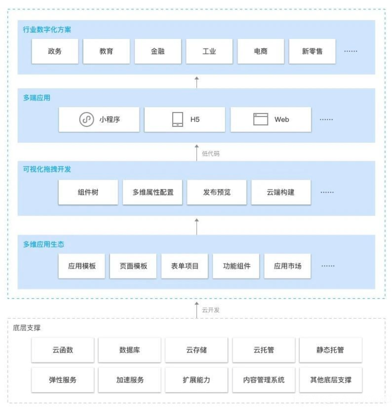 最近我们可能听到很火的一个技术话题就是lowcode. 云开发低码 LowCode 是高效、高性能的拖拽式低代码开发平台,向上连接前端的行业业务,向下连接云计算的海量能力,助力企业垂直上云。云开发低码将繁琐的底层架构和基础设施抽象化为图形界面,通过行业化模板、拖放式组件和可视化配置快速构建多端应用(小程序、H5应用、Web 应用等),免去了代码编写工作,让您能够完全专注于业务场景。云开发低码以云开发作为底层支撑,云原生能力将应用搭建的全链路打通,提供高度开放的开发环境,且时刻保障我们的应用。