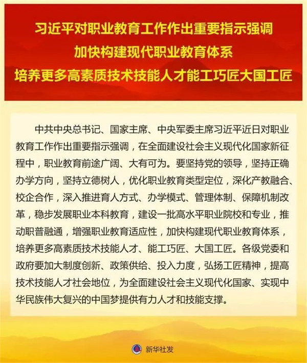 近期,习近平总书记对职业教育工作作出重要指示,“在全面建设社会主义现代化国家新征程中,职业教育前途广阔、大有可为。”为加快构建现代职业教育体系指明了前进方向。总书记的重要指示,必将促进职业教育体系更加完善,推动职业教育领域人才辈出,播下更多大国工匠的种子,为民族复兴汇聚强大力量。