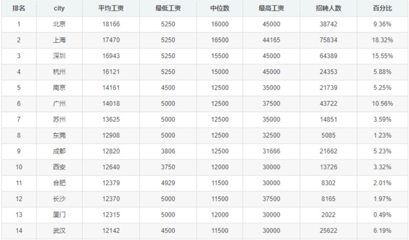 除此以外,招聘数量万级的城市还有武汉25622人、成都21662人、西安13726人。