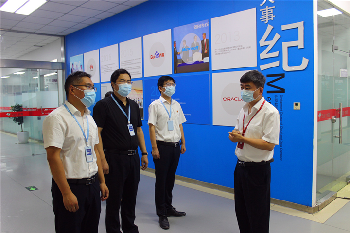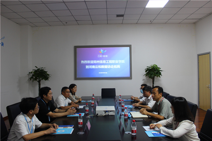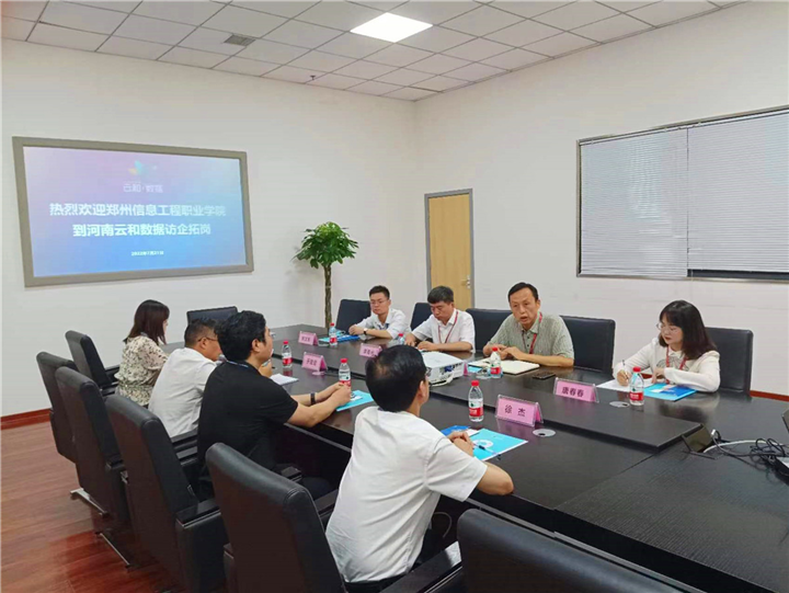 7月21日,郑州信息工程职业学院范玉峰副校长,就业创业办主任于建建,信息学院书记徐杰,信息学院党支部宣传委员柯志敏一行4人赴河南云和数据信息技术有限公司参观、访问。云和数据集团副总经理陈涛、云和数据云和服务事业部副总李春光、校企合作二部总监唐春春等陪同到访领导参观企业并进行座谈会。