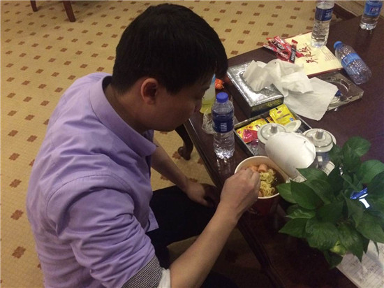 饿了就用泡面对付一口,困了就拿咖啡来提神,这一夜大家彻夜未眠,集体总结反思梳理业务,教务部门甚至是忙到早上六点钟。镜头拉到云和数据公司王总这里,1月23日晚对他来说注定是个不眠夜,三个会场来回跑,即使是吃泡面的时候也不曾坐下歇息片刻,调整、担当、责任,为的是2016云和数据能够百尺竿头更进一步!