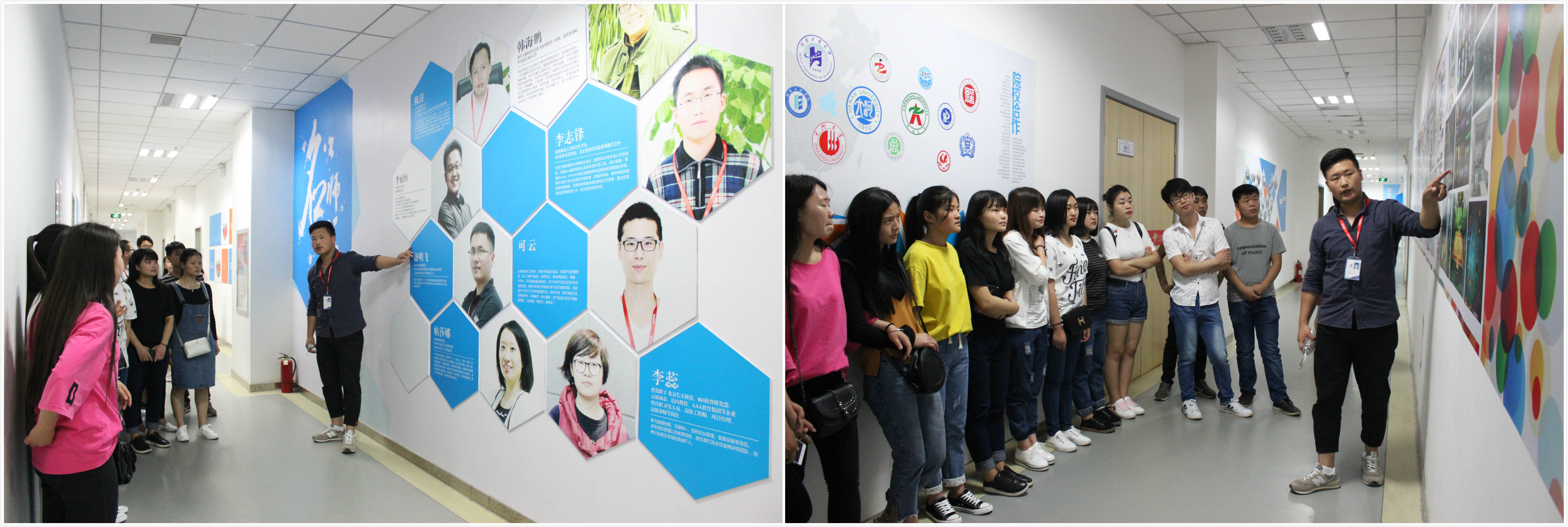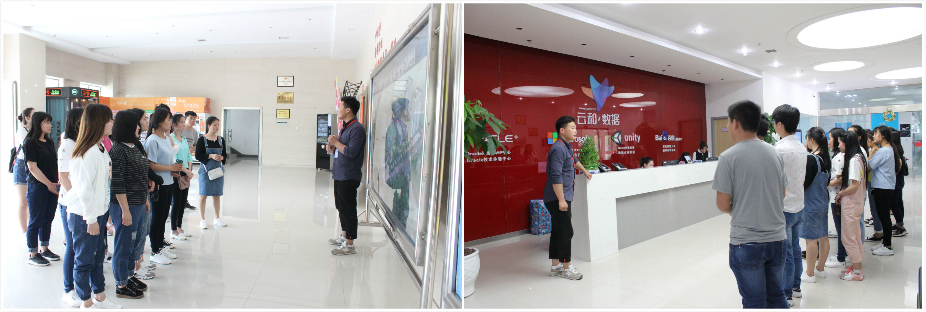 就在今天,新乡学院商学院电子商务学的师生和河南工贸职业技术学院的学生相继来到云和数据参观学习,毒辣的太阳都阻挡不住同学们的热情,在院校老师的带领下,兴致勃勃地对公司展开了参观。