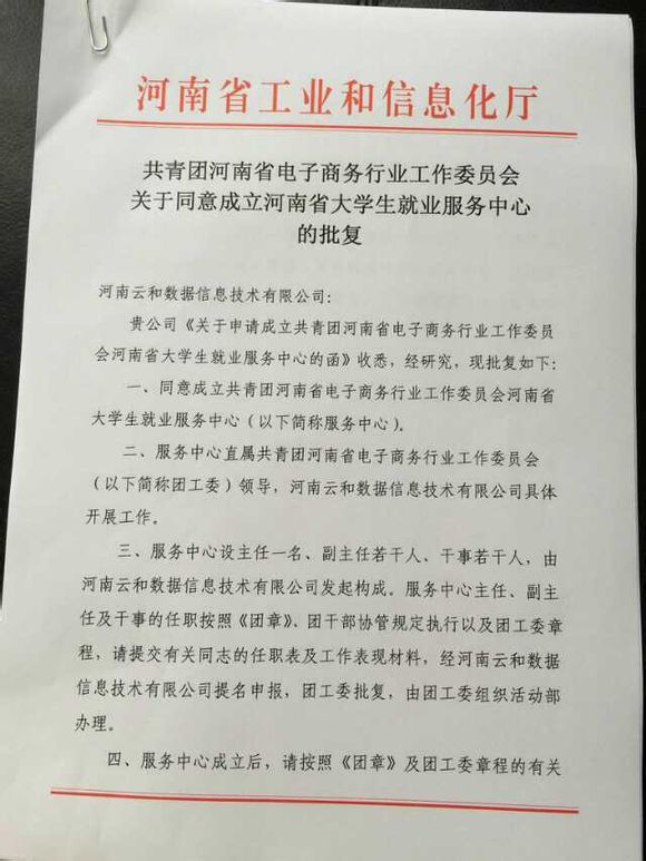 在河南省工信厅和团省委的支持领导下,河南云和数据信息技术有限公司于3月30日正式获批复 作为共青团河南省电子商务行业工作委员会河南省大学生就业服务中心落地单位。接下来,云和数据将积极推进落实好大学生就业与企业人才需求对接的线上线下服务工作。