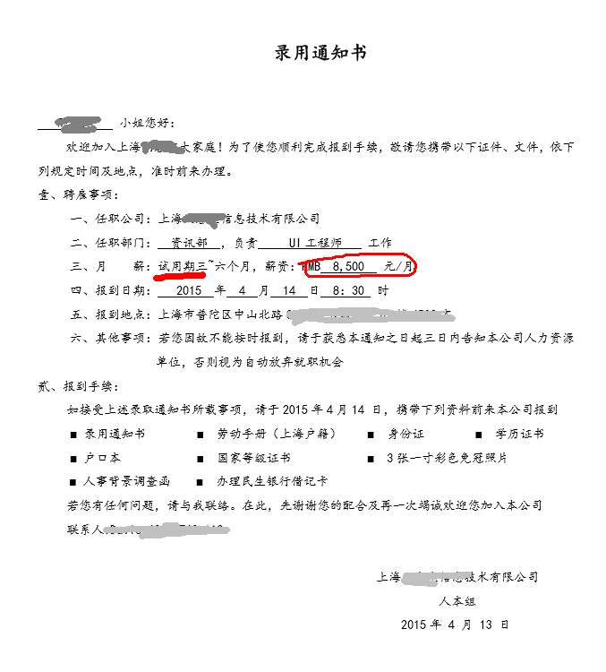 前几天曾报道UI班毕业学员仅在三个工作日内就陆续就业,试用期六千七千不等,时至今日,记录再次被打破,学员**以试用期薪资8500元/月入职于上海**信息技术有限公司。有图有真相!恭喜这位同学,真是我们的榜样呀,学弟学妹们加油努力,你们也可以的哦~