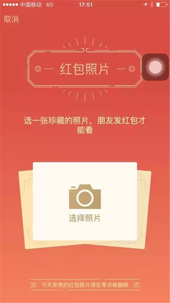 26日下午5点,微信平台推出“红包照片”功能,用户在发布朋友圈时,会看到“红包照片”选项,选择发布照片后便可以在朋友圈发送一张经过模糊处理的照片,好友想看清照片,需要向发布者发送红包,红包金额由微信随机决定。根据系统提示,红包照片功能将于当天下午8点下线,用户发布的红包照片将在零点被删除。