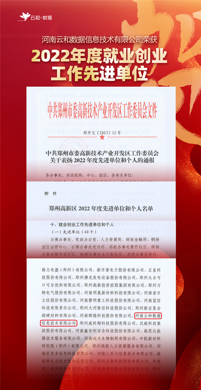 2023年1月15日,中共郑州市委高新技术产业开发区工作委员会发布《关于表扬2022年度先进单位和个人的通报》,对云和数据等40家企事业单位在2022年度就业创业工作中的先进表现进行通报表扬。在2022年度就业创业工作中,云和数据主动承担社会责任,结合自身 ...