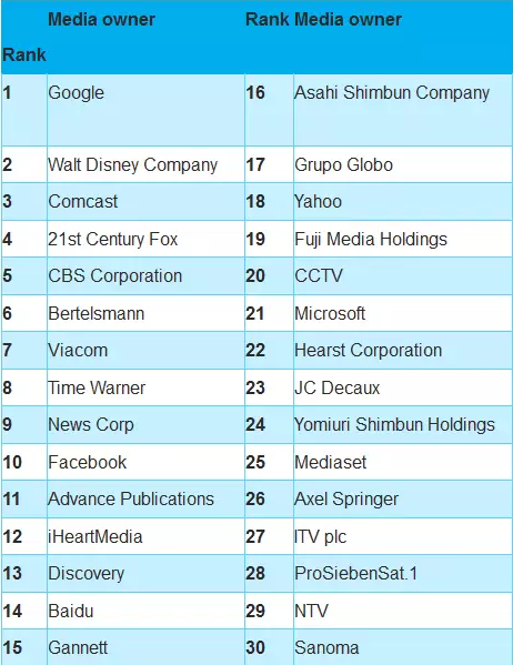 这个是2016年全球广告收入排名,谷歌第一,迪斯尼第二,但是谷歌是迪士尼的2倍有多,相信2017年的数据更甚。后面也有不少电视台很眼熟,例如我最爱之一的Discovery。